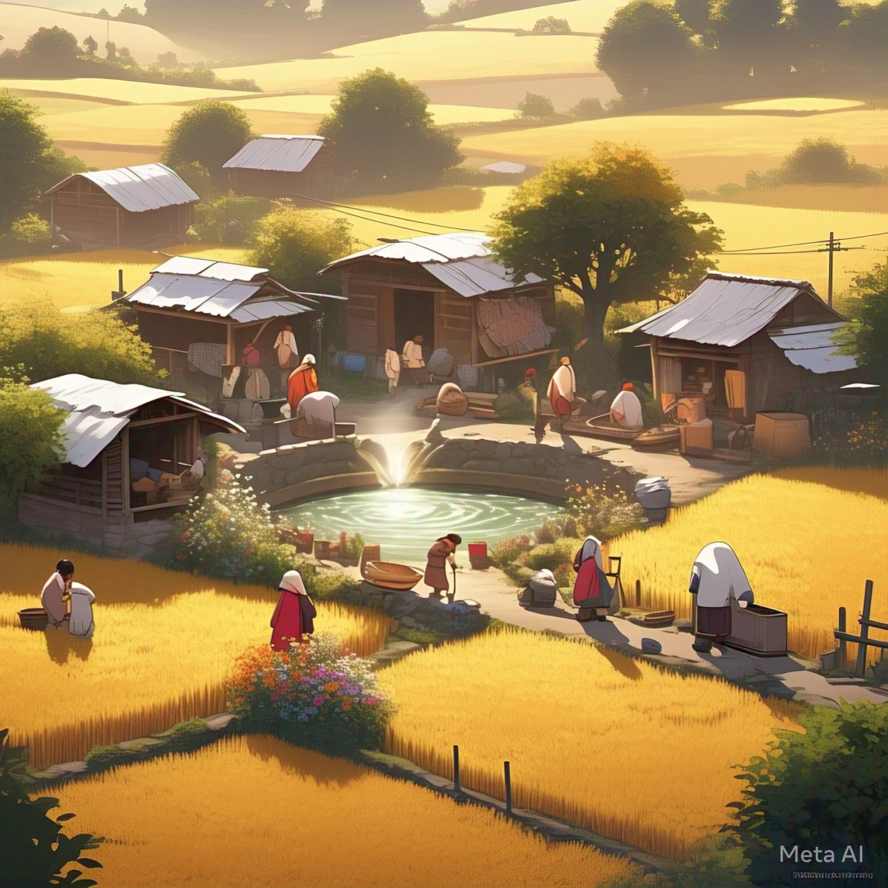 A serene village nestled in golden fields with a shining well in the center, surrounded by villagers